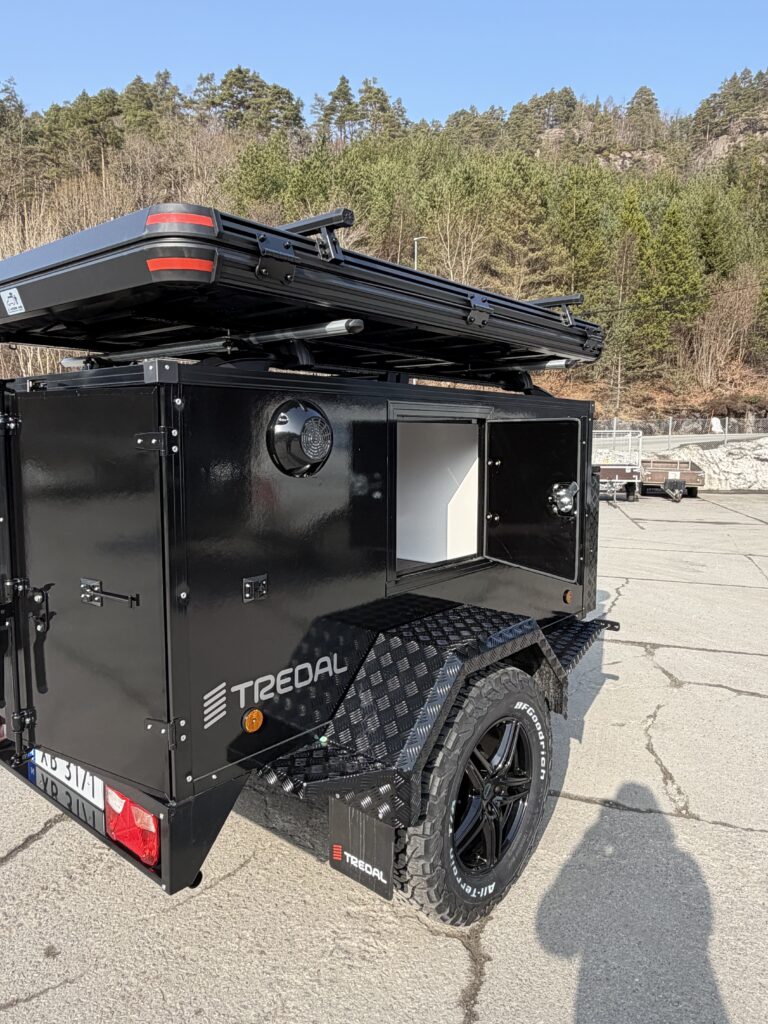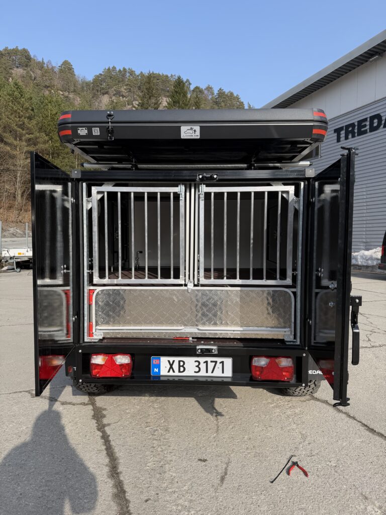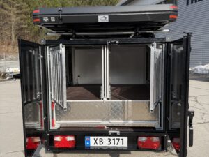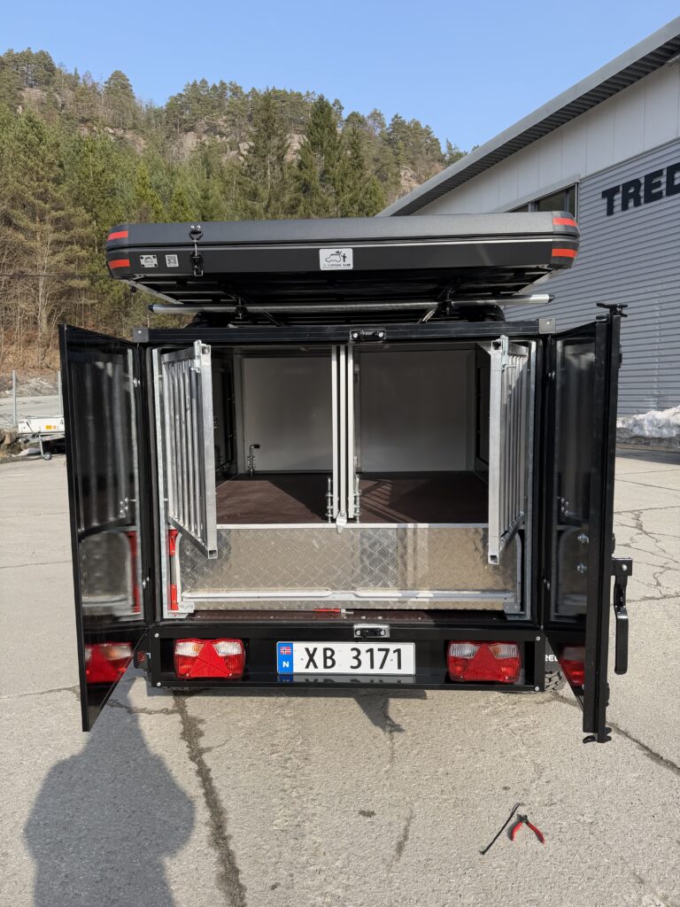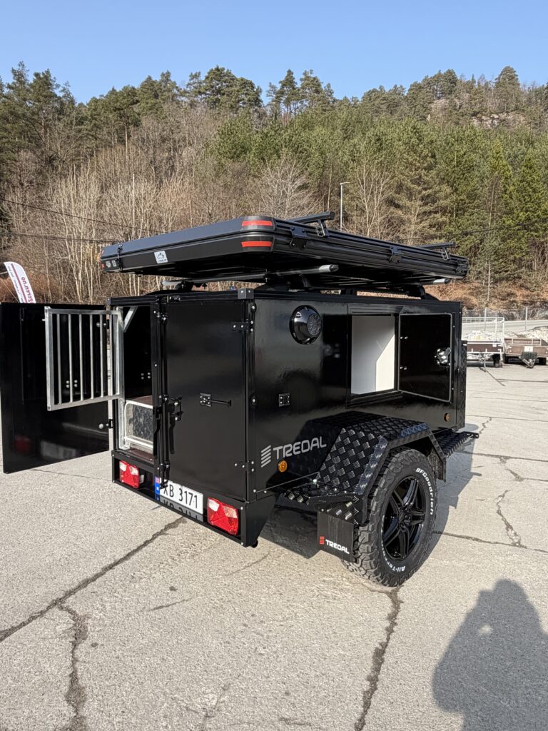 En gjennomført hunde- og campinghenger bygget på en solid T-13 UCS offroadhenger, pulverlakkert i sort for et tøft og eksklusivt uttrykk.