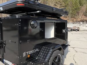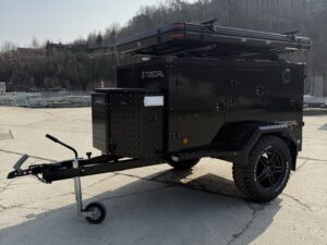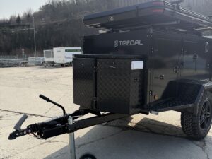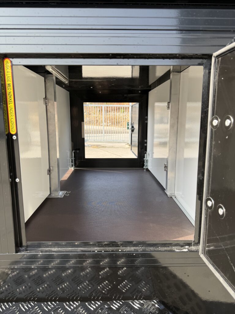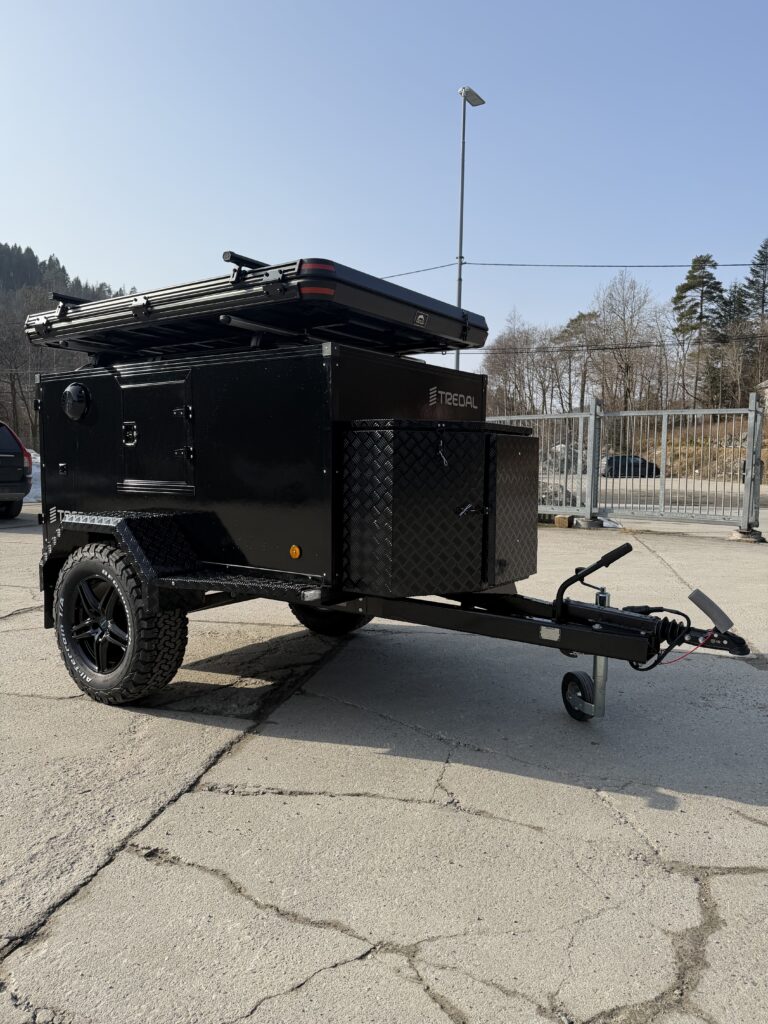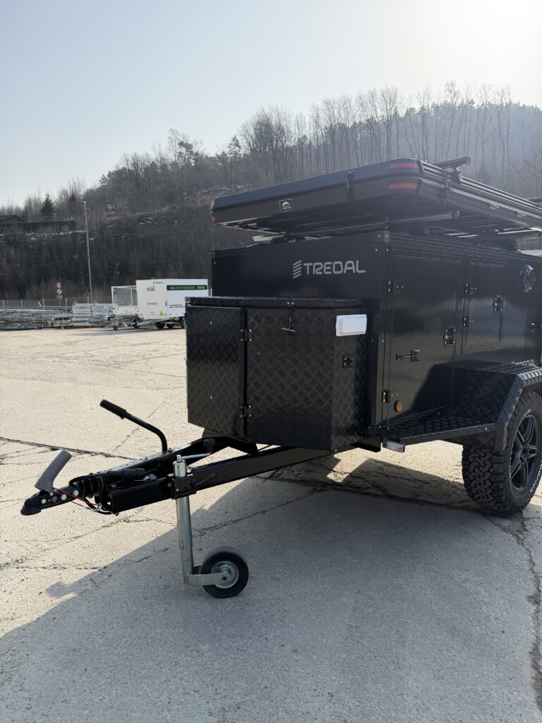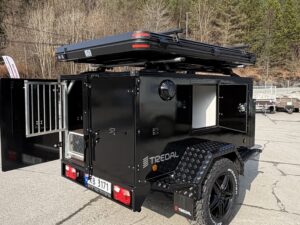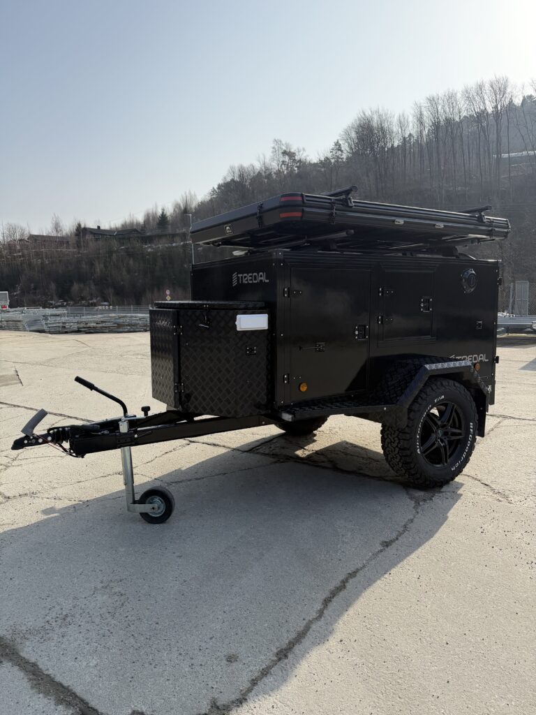 En gjennomført hunde- og campinghenger bygget på en solid T-13 UCS offroadhenger, pulverlakkert i sort for et tøft og eksklusivt uttrykk.