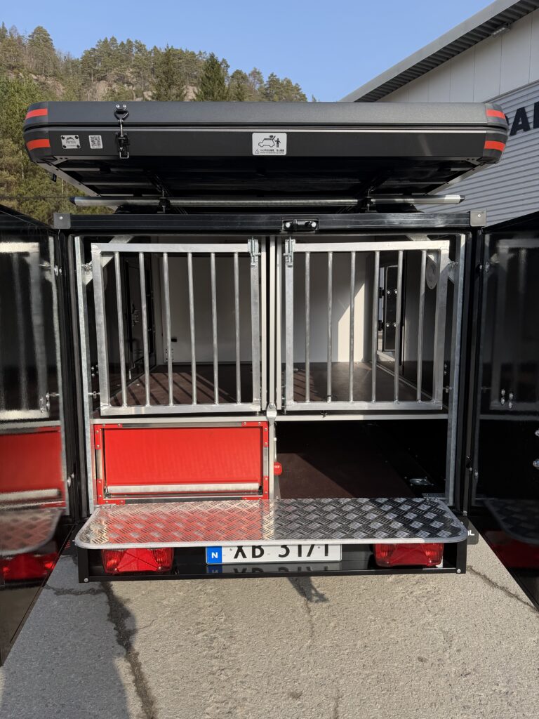Hengeren har fire rom for hunder med skillevegger som kan åpnes. Hundene kan slippes inn fra både høyre og venstre side. På venstre side finner du to dører – én til hunderommet og én med skuffe og et praktisk, utdragbart kjøkken.
